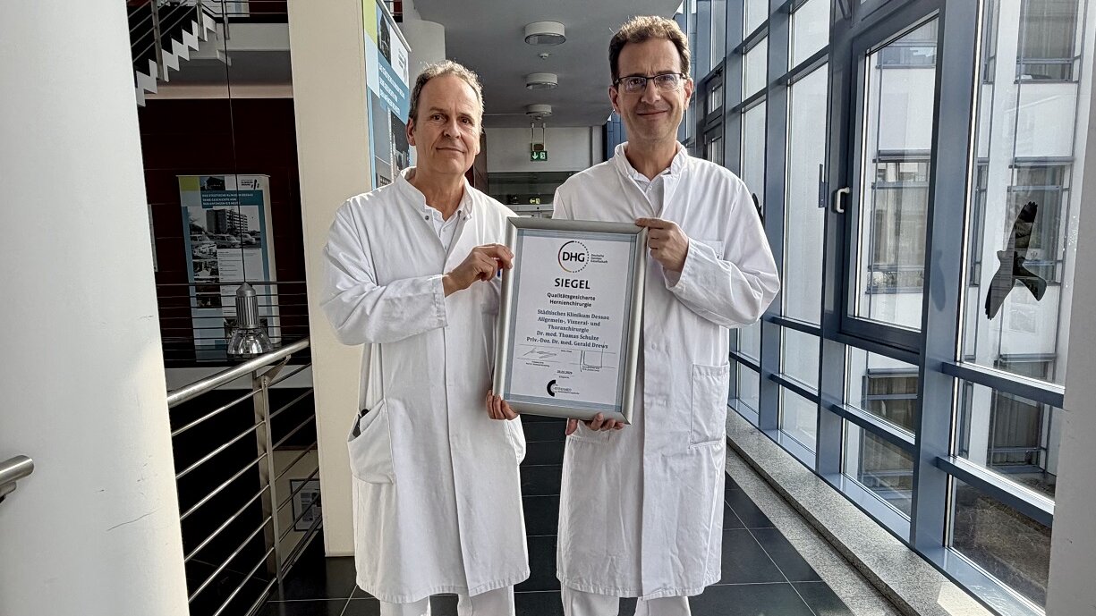 Das Städtische Klinikum Dessau ist erneut für seine hohe Qualität in der Behandlung von Bauchwandbrüchen ausgezeichnet worden. Die Klinik für Allgemein-, Viszeral- und Thoraxchirurgie erhielt bereits zum zweiten Mal in Folge das Siegel „Qualitätsgesicherte Hernienchirurgie“ der Deutsche Hernien Gesellschaft. Die Re-Zertifizierung bestätigt die dauerhaft hohe fachliche Kompetenz des Behandlungsteams und die verlässliche Versorgungsqualität für Patientinnen und Patienten mit Hernien.
