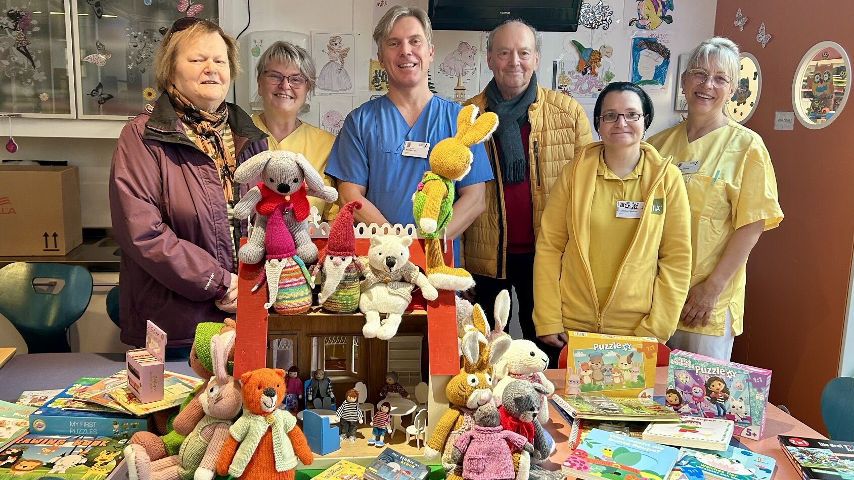 „Die Tiere von Frau Behrmann können wir für die Kinder sehr gut als Tröste- und Tapferkeitstiere einsetzen“, erklärt Schwester Sabine bei der Übergabe. Und damit nicht genug: Zusätzlich übergaben Gabriele und Klaus Behrmann zahlreiche Kinderbücher und Spiele. „Als eine Freundin hörte, was wir vorhaben, übergab sie mir eine ganze Kiste mit Büchern und Spielen für die Klinik“, berichtet Gabriele Behrmann. Auch diese Spende kam sehr gut an. „Die Bücher und Spiele eignen sich hervorragend zur Ablenkung der Kinder“, so Schwester Sabine.