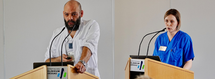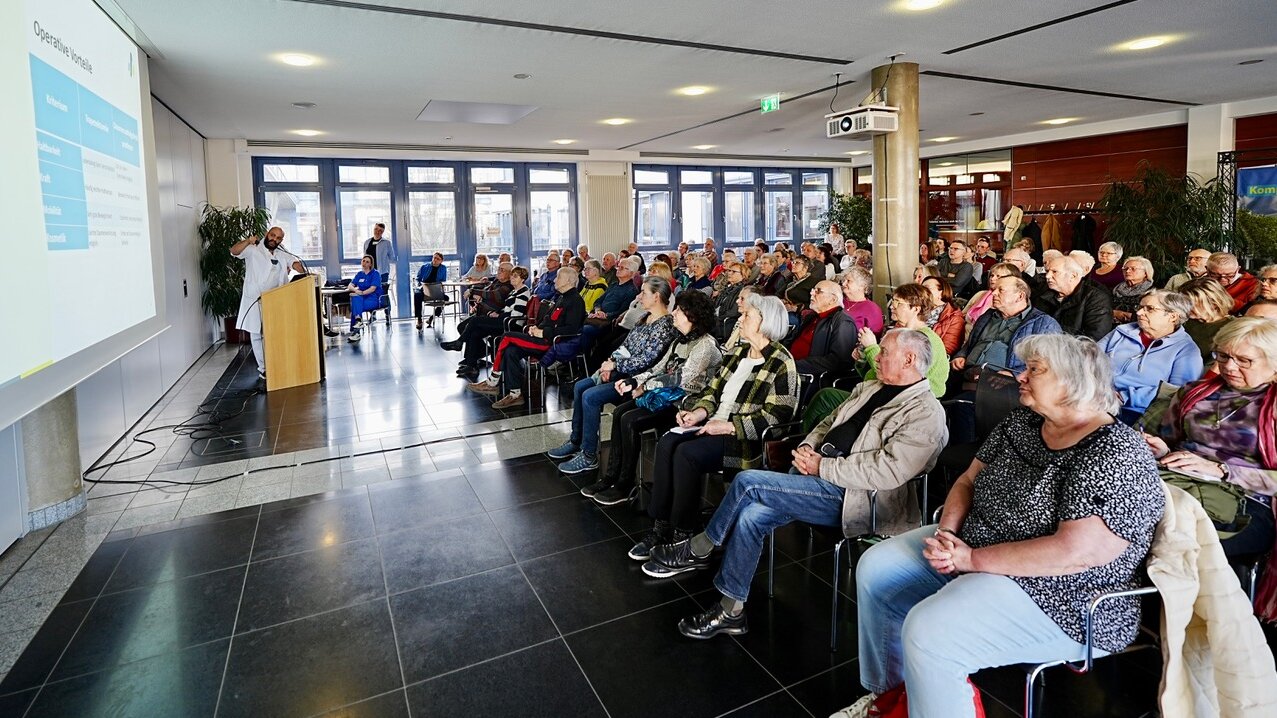 Den Auftakt der Vortragsreihe gestalteten Dr. med. Josefine Laser und Oberarzt Mohamed Eldougdoug. In ihrem Vortrag „Das schmerzende Marmeladenglas – Hilfe bei Daumensattelgelenksarthrose (Rhizarthrose)“ widmeten sie sich einer der häufigsten Verschleißerkrankungen der Hand. Für die medizinischen Laien im Publikum begann der Vortrag zunächst mit einer kurzen, verständlichen Einführung in die Anatomie des Daumensattelgelenks. Schnell wurde deutlich, wie entscheidend dieses kleine Gelenk für alltägliche Bewegungen ist – für das Greifen, Drehen oder eben das Öffnen eines Marmeladenglases. Wenn sich hier eine Arthrose entwickelt, können genau diese Handgriffe zur Herausforderung werden. Die beiden Handchirurgen erklärten anschaulich, wie eine Rhizarthrose entsteht, welche Auswirkungen sie im Alltag haben kann und welche Möglichkeiten der Diagnose bestehen. Ebenso verständlich stellten sie konservative Behandlungsmöglichkeiten sowie operative Verfahren vor. Besonders aufmerksam hörten viele Besucher zu, als Oberarzt Eldougdoug den Unterschied zwischen einer Trapezektomie und einer Daumensattelgelenkprothese erläuterte.