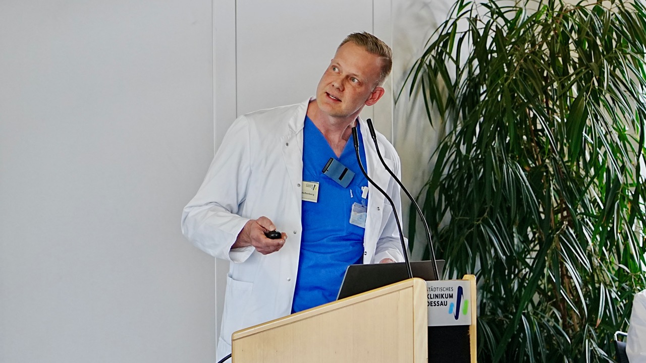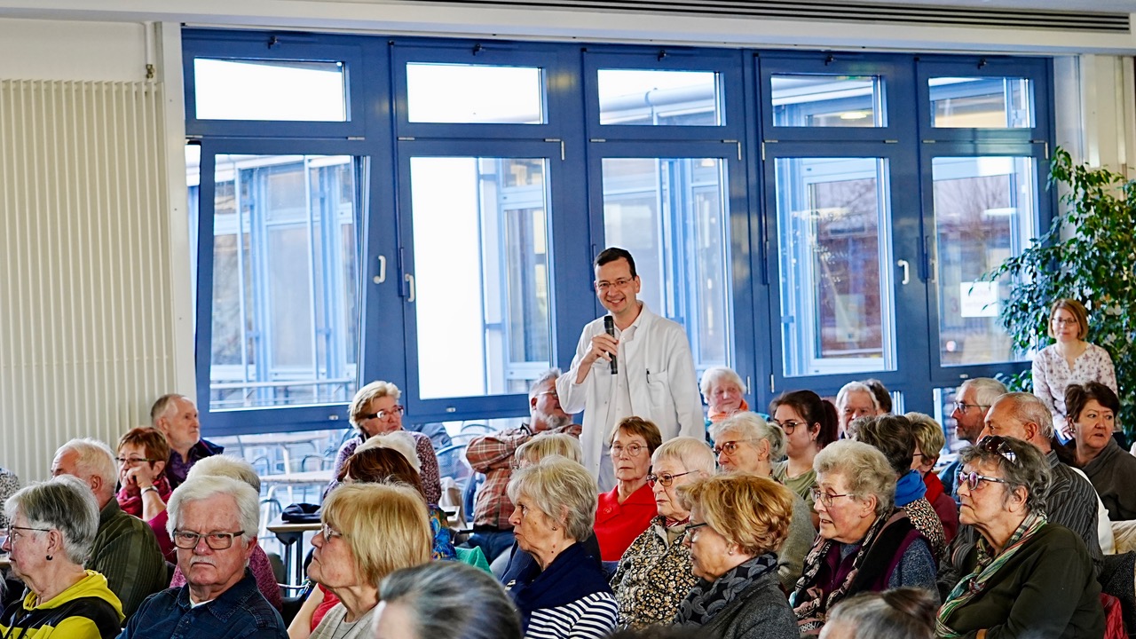 Im Anschluss nahm Oberarzt Dr. med. Kristian Weißenberg die Zuhörer zunächst gedanklich mit auf eine ungewöhnliche Reise: vom Atlantik vor La Gomera bis in die Karibik. Die Geschichte einer Ruderetappe diente als anschauliches Beispiel für extreme, wiederholte Griffbelastungen – und führte damit direkt zum Thema seines Vortrags „Haken, Schnappen, Springen – Was tun beim schnellenden Finger?“. Mithilfe kurzer Videos erklärte Dr. Weißenberg sehr anschaulich, was hinter dem sogenannten schnellenden Finger steckt. Betroffene kennen das Phänomen: Ein Finger bleibt plötzlich hängen, schnellt ruckartig nach vorne oder blockiert sogar vollständig. Der Handchirurg erläuterte, warum diese Beschwerden entstehen, woran man sie erkennt und wann eine Behandlung sinnvoll ist. Wenn das schmerzhafte Schnappen bestehen bleibt und den Alltag erheblich beeinträchtigt, kann ein kleiner operativer Eingriff helfen. Ziel sei es, dass die Sehne wieder frei gleiten kann und die Schmerzen nachlassen. Um möglichen Sorgen vorzubeugen, erklärte Dr. Weißenberg ruhig und detailliert den Ablauf des Eingriffs, die Anästhesie sowie die anschließende Nachbehandlung. Die Erfolgsquote liege dabei deutlich über 90 Prozent.