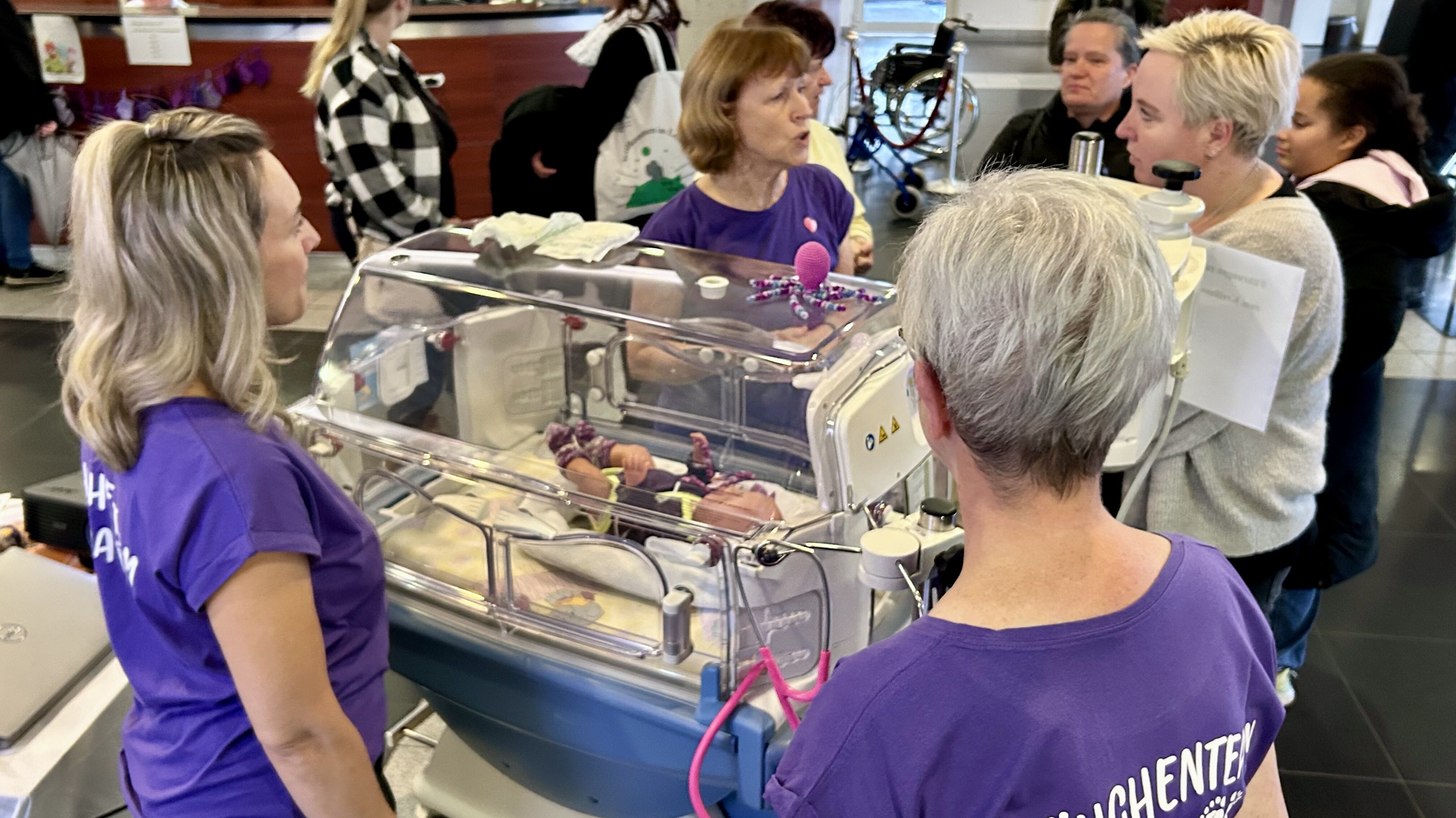 Der Nachmittag bot damit nicht nur viele Eindrücke, sondern auch eine Einladung, das Thema Frühgeburtlichkeit bewusst in den Blick zu nehmen. Weltweit wird am 17. November an die besonderen Herausforderungen erinnert, denen Frühgeborene und ihre Familien begegnen. Das Klinikum Dessau setzt dazu jedes Jahr ein sichtbares Zeichen: Auch gestern Abend leuchtete das Hauptgebäude wieder in kräftigem Lila – als Teil der internationalen Aktion „Purple for Preemies“.