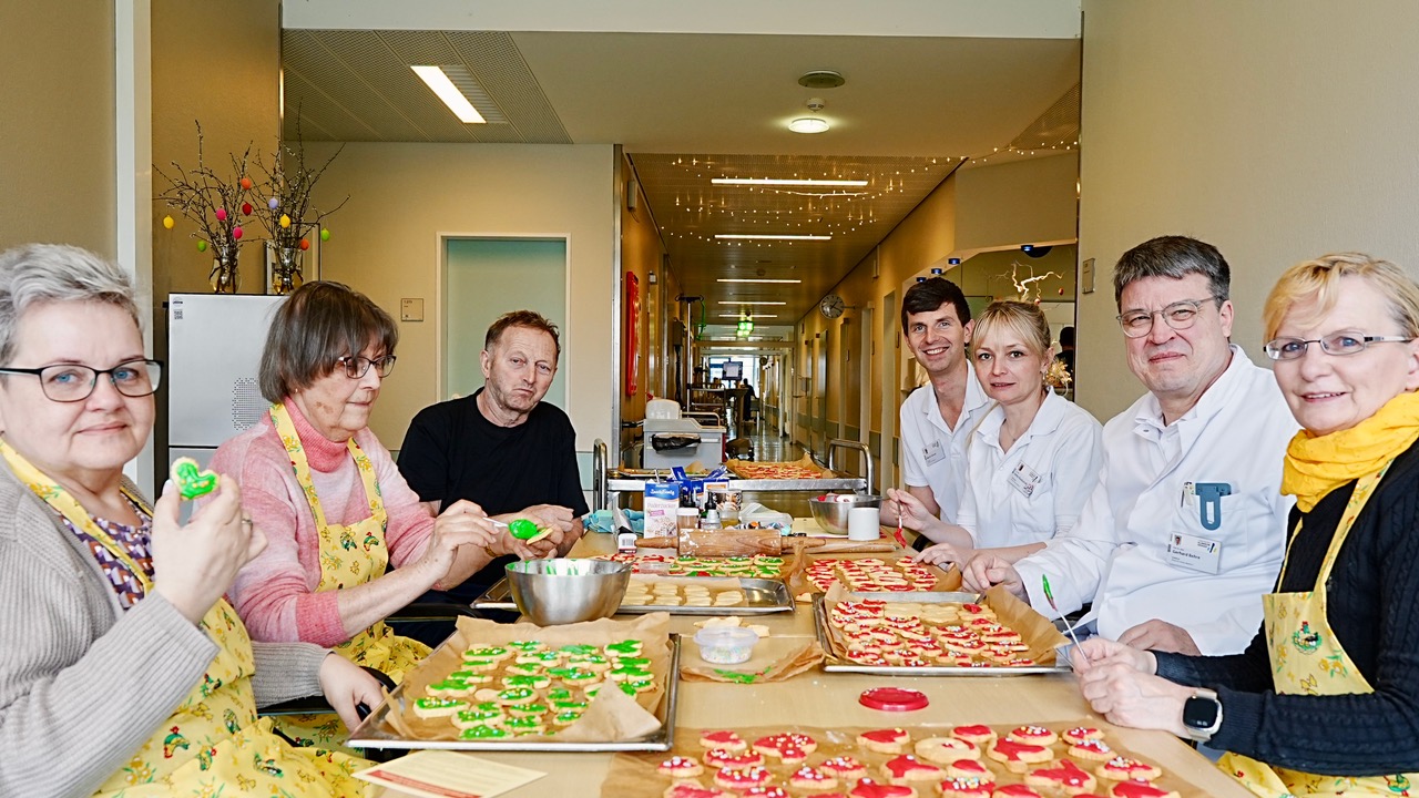 Schon kurze Zeit später kehrten die frisch gebackenen Plätzchen zurück auf Station 16, wo sie mit buntem Zuckerguss liebevoll verziert werden. Für Pareigis hat diese Aktion eine besondere Bedeutung: „Es ist nicht nur ein wunderbares Training für die Hände – die Menschen kommen dabei auch auf andere Gedanken.“ Sie weiß, wovon sie spricht: Vor mehr als 20 Jahren überstand sie selbst eine schwere Blutkrebserkrankung und leitet seit 2004 die Selbsthilfegruppe.