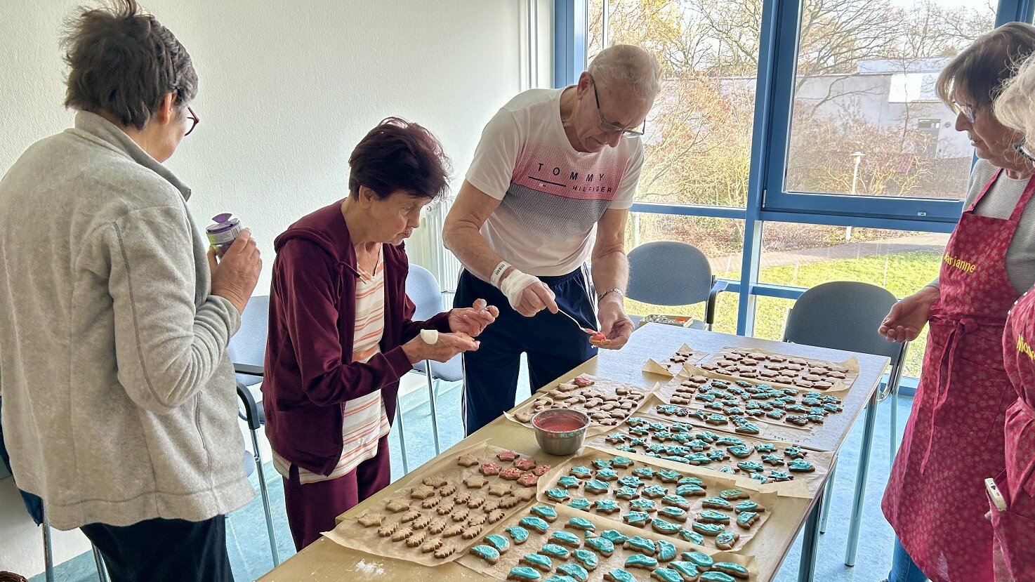 Schon kurze Zeit später kehrten die frisch gebackenen Plätzchen zurück auf Station 16, wo sie mit buntem Zuckerguss liebevoll verziert wurden. Für Pareigis hat diese Aktion eine besondere Bedeutung: „Es ist nicht nur eine wunderbare Ergotherapie – die Menschen kommen dabei auch auf andere Gedanken.“ Sie weiß, wovon sie spricht: Vor mehr als 20 Jahren überstand sie selbst eine schwere Blutkrebserkrankung und leitet seit 2004 die Selbsthilfegruppe.