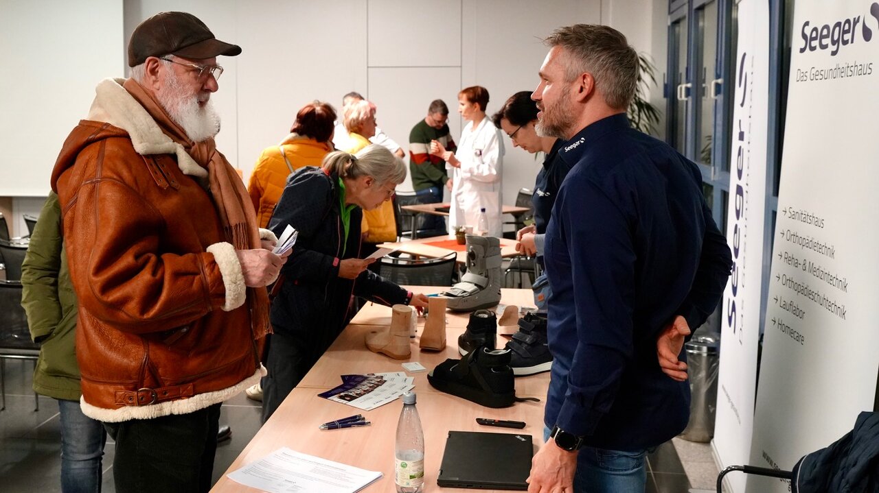 Den dritten Vortrag gestaltete Sven Ebersbach, Orthopädieschuhmacher vom Sanitätshaus Seeger, zum Thema „Diabetisches Fußsyndrom – Folgeerkrankung eines Diabetes“. Er erläuterte Klassifikationen und Stadien, sprach über Fußbrüche infolge von Diabetes, Ursachen und Symptome sowie therapeutische Ansätze. Besonders deutlich wurde, wie wichtig Prävention, frühe Erkennung und eine interdisziplinäre Versorgung sind. Das Sanitätshaus Seeger war zudem mit einem Stand vor Ort und präsentierte orthopädische Maßschuhe für Betroffene.