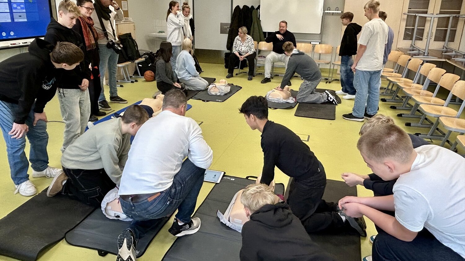 Nach einem theoretischen Einstieg, der bewusst im Stil von Instagram- und TikTok-Videos gehalten war, ging es für die Teenager zu den Übungspuppen. Dort konnten sie selbst ausprobieren, wie eine Herzdruckmassage richtig ausgeführt wird.