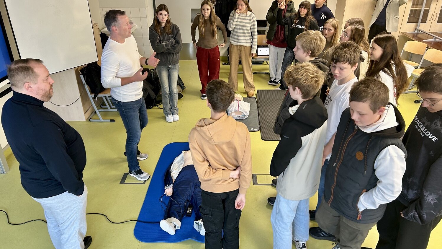 Mit Dänemark begann auch Dr. Fürnau seine Einführung beim Training in der Schule. Um das Eis zu brechen, fragte er die Schülerinnen und Schüler, ob sie den Fußballer Christian Eriksen kennen. Dieser war im Juni 2021 während eines Länderspiels ohne Fremdeinwirkung zusammengebrochen und musste noch auf dem Spielfeld reanimiert werden. Eriksen überlebte – und spielt bis heute professionell Fußball. Fürnau wollte damit eines deutlich machen: Ein Herzstillstand kann überall passieren – im Stadion, in der Öffentlichkeit oder sogar in der eigenen Familie.